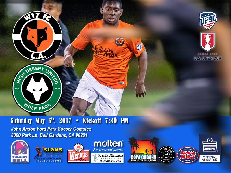 A week after playing games on back-to-back days, W17 FC plays High Desert United in a United Premier Soccer League (UPSL) Championship Division Western Conference game at John Anson Ford Stadium (8000 Park Ln., Bell Gardens, CA 90201), at 7:30 p.m. on Saturday, May 6.