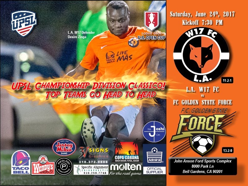 L.A. W17 FC (11-2-1 overall) last defeated OC Crew, 3-2, in a UPSL Championship Division Western Conference game on Sunday, June 18.