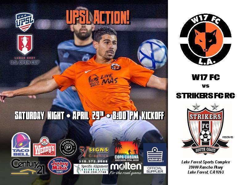 The team next plays Strikers FC South Coast (Reserves) in a United Premier Soccer League (UPSL) Championship Division Western Conference game at Lake Forest Sports Park (28000 Rancho Pkwy, Lake Forest, CA 92630), at 8 p.m. on Saturday, April 29.