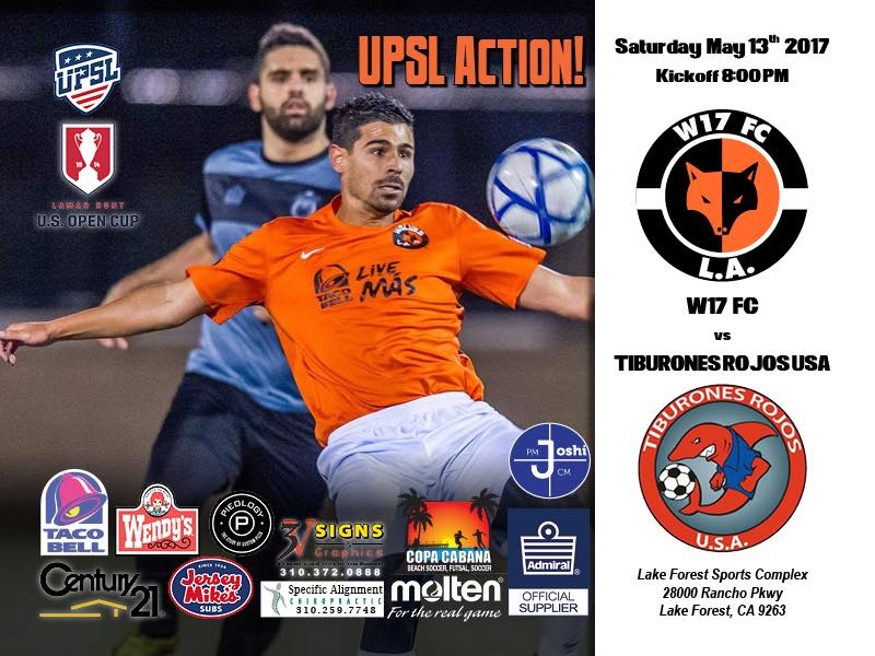 Riding four consecutive victories, W17 FC plays Tiburones Rojos USA in a United Premier Soccer League (UPSL) Championship Division Western Conference game at Lake Forest Sports Complex (28000 Rancho Pkwy, Lake Forest, CA 92630), at 8:00 p.m. on Saturday, May 13.