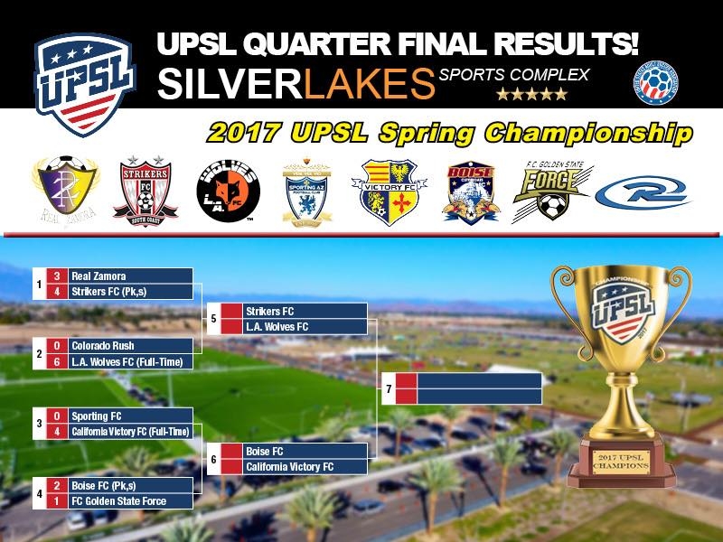 Top-seeded L.A. Wolves FC plays Strikers FC South Coast, and California Victory FC plays Boise FC in the semifinal round of the UPSL Spring Playoff Championship at SilverLakes Sports Complex (5555 Hamner Ave., Norco, CA 92880) at 7:30 p.m. on Saturday night.