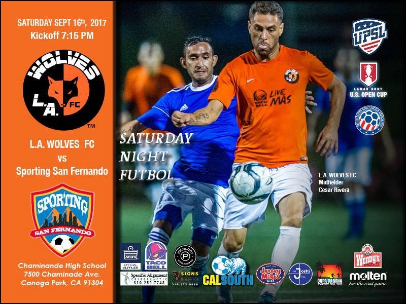 Wolves FC travels to play Sporting San Fernando in a United Premier Soccer League (UPSL) Pro Premier Division Western Conference 2017 Fall Season opener at Chaminade High School (7500 Chaminade Ave., West Hills, CA 91304) at 7:15 p.m. on Saturday, Sept. 16.