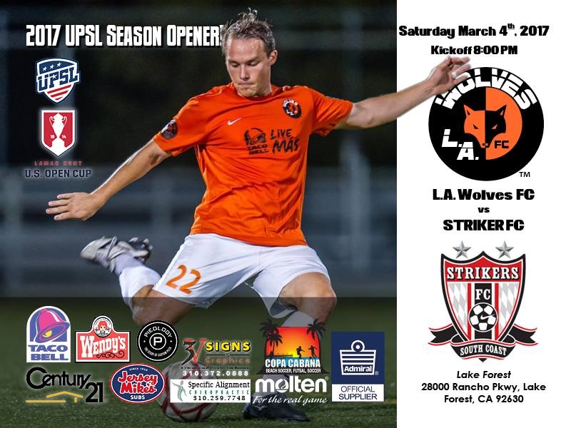 L.A. Wolves FC Sporting Director Michael Collins said, "It's great to start another UPSL season as the Wolves are on the great things. Playing at Strikers FC South Coast is always a difficult task, but we've been together for a while now and we've done a lot to prepare for 2017. We have a talented team that continues to grow. We have some skilled additions to go with our very accomplished core group, and many players who are ready to step up when called. It's an exciting time to be a part of L.A. Wolves FC, and we thank our sponsors and supporters as we start the Spring Season."