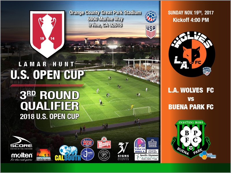 L.A. Wolves FC plays Buena Park FC (USASA) at 4 p.m. on Sunday, Nov. 19 at the Championship Stadium at OC Great Park (6950 Marina Way, Irvine, CA 92618) in Qualifying Round 3 for the 2018 Lamar Hunt U.S. Open Cup tournament.
