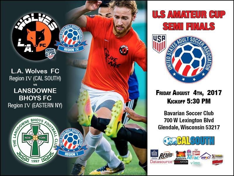 L.A. Wolves FC will play New York’s Lansdowne Bhoys Football Club in the semifinals of the 2017 USASA National Amateur Cup at Heartland Value Fund Stadium (700 W. Lexington Blvd., Glendale, WI 53217) tonight at 5:30 p.m. CT.