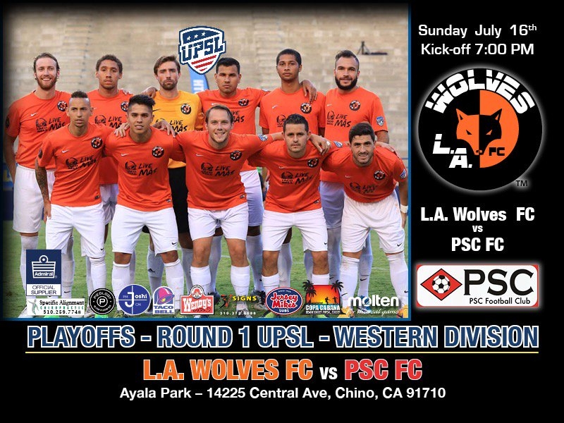 Wolves FC plays PSC Football Club in a United Premier Soccer League (UPSL) Pro Premier Division Western Conference Playoff Game at Ruben S. Ayala Park (14225 Central Ave., Chino CA 91710) at 7 p.m. on Sunday, July 16.