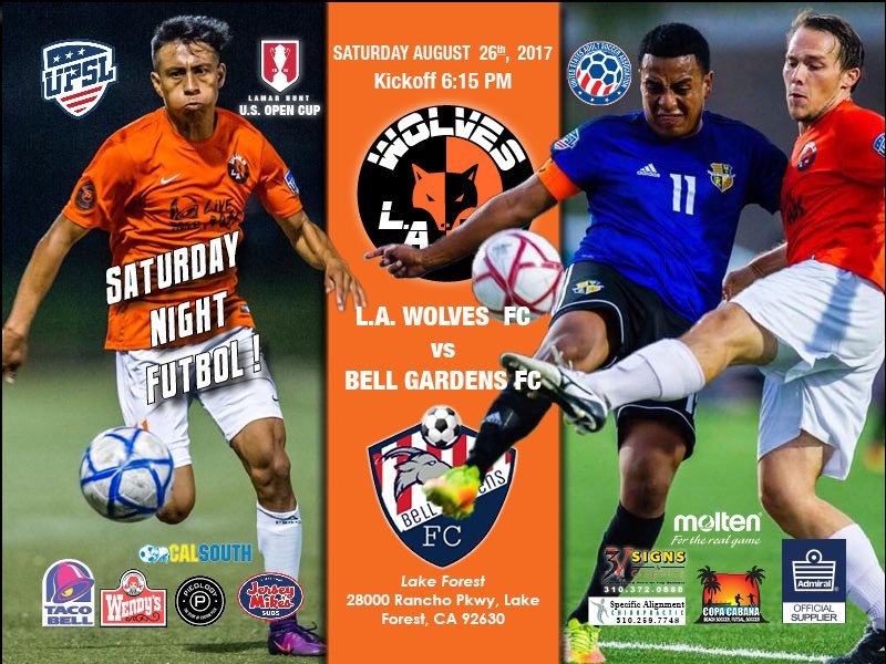 Wolves FC plays Bell Gardens FC in a United Premier Soccer League (UPSL) preseason friendly at Lake Forest Sports Complex (28000 Rancho Pkwy, Lake Forest, CA 92630) at 6:15 p.m. on Saturday, August 26.