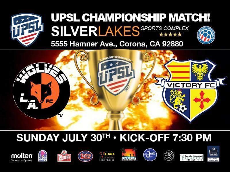 Top-seeded L.A. Wolves FC plays California Victory FC in the UPSL Spring Playoff Championship Final at SilverLakes Sports Complex (5555 Hamner Ave., Norco, CA 92880) at 7:30 p.m. on Sunday night.