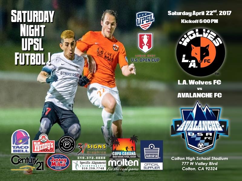 Wolves FC plays Avalanche USA FC in a United Premier Soccer League (UPSL) Pro Premier Division at Colton High School Stadium (777 W. Valley Blvd, Colton, CA 92324), at 6:00 p.m. on Saturday, April 22.