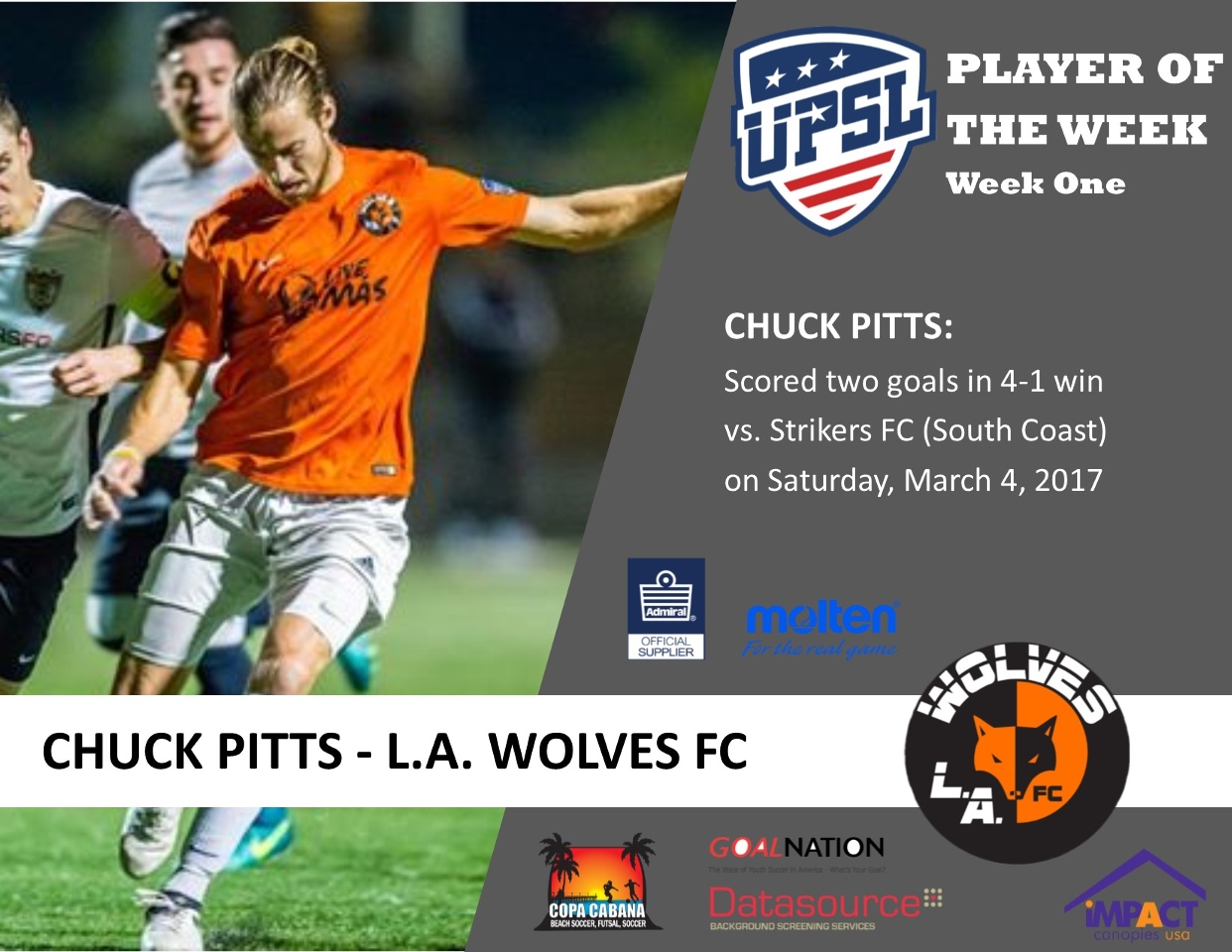 March 6, 2017 – Los Angeles - L.A. Wolves FC forward Chuck Pitts has been named UPSL Player of the Week. The California native had two goals in the Wolves’ 4-1 victory over Strikers FC (South Coast) on Saturday, March 4.